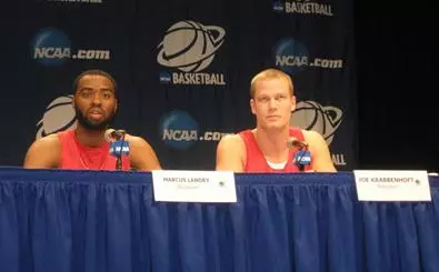 MARCUS LANDRY: In the locker room it was great. I found myself coming into the locker room thinking about what happened the first half. But Joe got up and talked and said some things and it really got my spirits lifted. And he told us, Hey, we got one more half to play, we got 20 minutes of basketball. It's not over. And like they said, Coach came and said the same thing, you know, 0-0. He pointed out some things we needed to do better and we came out and first five minutes we got off to a great start and the way we finished the game was tremendous.